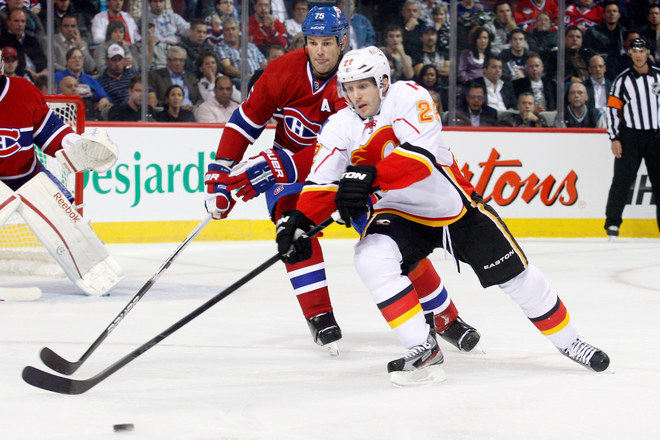 MONTREAL, CANADA – OCTOBER 13: Lee Stempniak #22 of the Calgary Flames and Hal Gill #75 of the Montreal Canadiens battle for the puck during the NHL game at the Bell Centre on October 13, 2011 in Montreal, Quebec, Canada. (Photo by Richard Wolowicz/Getty Images)