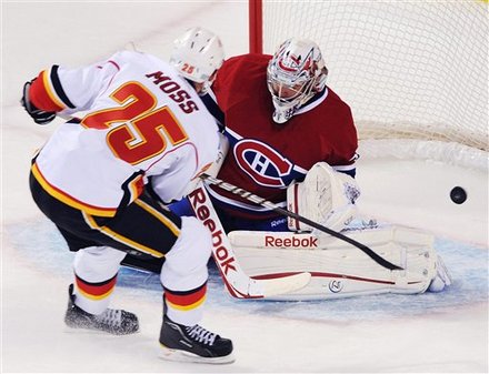 Calgary Flames’ David Moss scores on Montreal Canadiens goaltender Carey Price during the first period of an NHL hockey game in Montreal, Thursday, Oct. 13, 2011. (AP Photo/The Canadian Press, Graham Hughes)