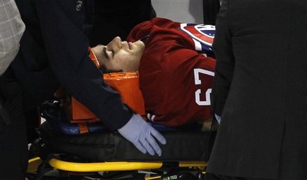 Montreal Canadiens’ Max Pacioretty is wheeled away on a stretcher after taking a hit by Boston Bruins’ Zdeno Chara during the second period of an NHL hockey game, Tuesday, March 8, 2011, in Montreal. (AP Photo/The Canadian Press, Paul Chiasson)