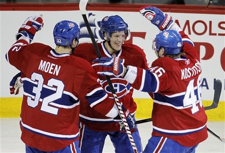 Montreal Canadiens’ Lars Eller, center, celebrates his second goal with teammates Travis Moen, left, and Andrei Kostitsyn as they face the Boston Bruins during the first period of an NHL hockey game, Tuesday, March 8, 2011, in Montreal. (AP Photo/The Canadian Press, Paul Chiasson)