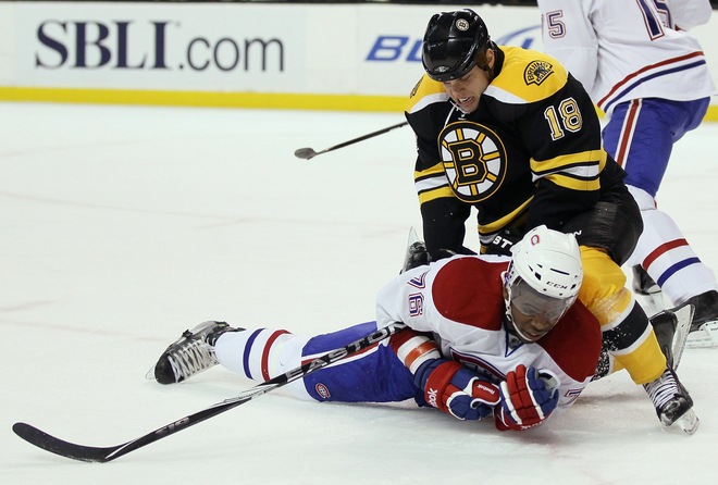 BOSTON, MA – FEBRUARY 09: Nathan Horton #18 of the Boston Bruins shoves P.K. Subban #76 of the Montreal Canadiens on February 9, 2011 at the TD Garden in Boston, Massachusetts. (Photo by Elsa/Getty Images)