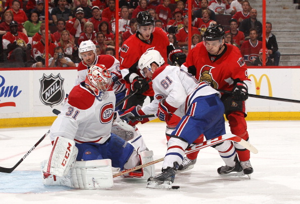 OTTAWA, CANADA – MAY 5: Milan Michalek #9 and Kyle Turris #7 of the Ottawa Senators battle for the loose puck against Carey Price #31 and Raphael Diaz #61of the Montreal Canadiens in Game Three of the Eastern Conference Quarterfinals during the 2013 NHL Stanley Cup Playoffs at Scotiabank Place, on May 5, 2013 in Ottawa, Ontario, Canada. (Photo by Jana Chytilova/Freestyle Photography/Getty Images)