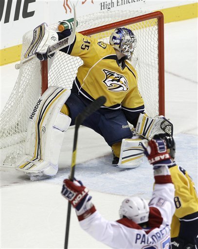 Nashville Predators goalie Pekka Rinne (35), of Finland, looks back for the puck after Montreal Canadiens left wing Max Pacioretty, bottom, scored the game-winning goal in the overtime period of an NHL hockey game on Saturday, Nov. 12, 2011, in Nashville, Tenn. The Canadiens won 2-1. (AP Photo/Mark Humphrey)