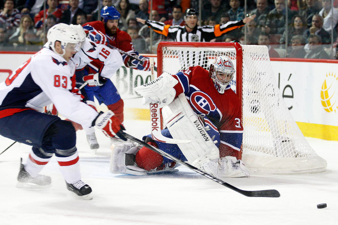 MONTREAL, CANADA – MARCH 15: Goalie Carey Price #31 of the Montreal Canadiens watches a puck rebound in front of Jay Beagle #83 of the Washington Capitals during the NHL game at the Bell Centre on March 15, 2011 in Montreal, Quebec, Canada. The Capitals defeated the Canadiens 4-2. (Photo by Richard Wolowicz/Getty Images)